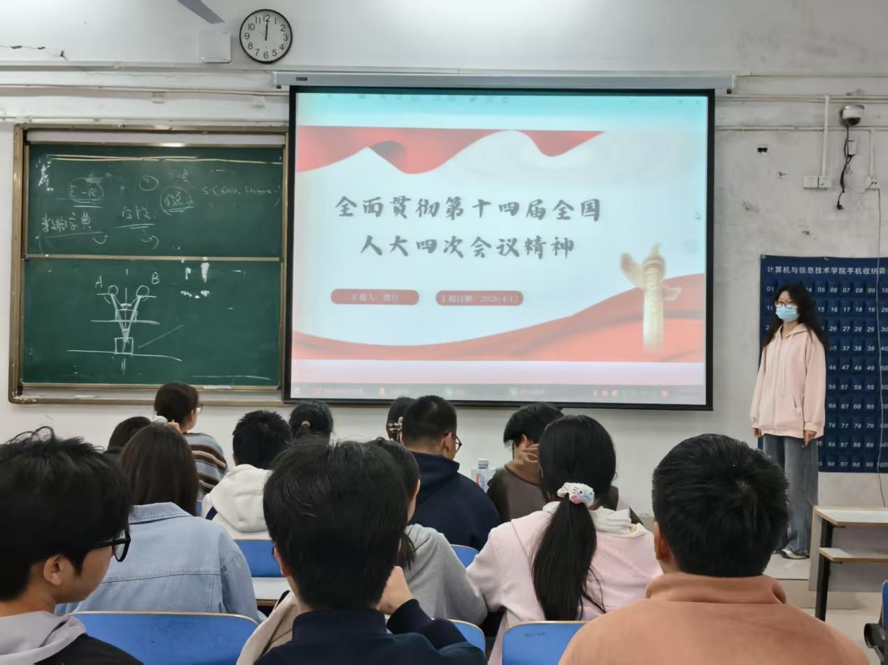为深入学习贯彻第十四届全国人大四次会议精神,引导青年学生把握时代方向、强化使命担当,4月12日下午,我院25级计科二班于计科楼104教室开展“全面贯彻第十四届全国人大四次会议精神”主题团课。本次团课由团支书殷月主持,本团支部全体成员参与学习。